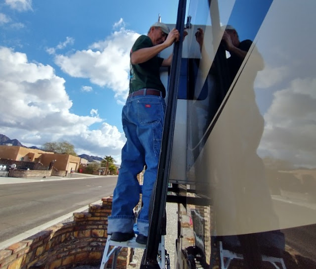 Gari climbs the ladder below to remove the remnants of the weather strip adhesive that remained on the exterior trailer wall. As with all painting and sealing jobs, most of the effort is in preparation of the surfaces, so that the paint or sealants will adhere very well. Gari scraped and followed with contractor solvent, then finished with denatured alcohol. Clean as new!