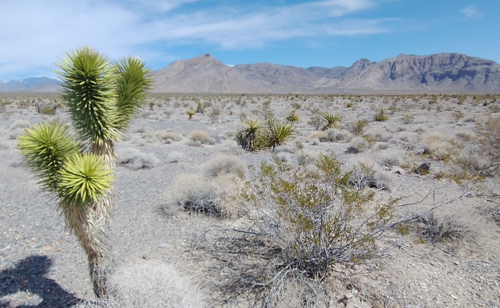 Steve stands next to a very young Joshua Tree and points to the last rock cairn marker that we would reach that day. According to Gari's handheld GPS we we 2-1/4 miles into the desert. We reckoned that we were still about 1-1/2 miles from the base of the front mountains. We can barely see Mt. Charleston from here.